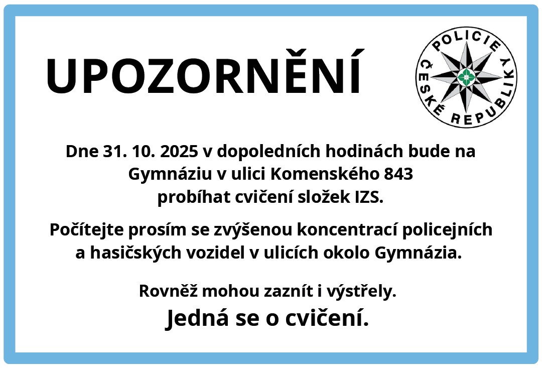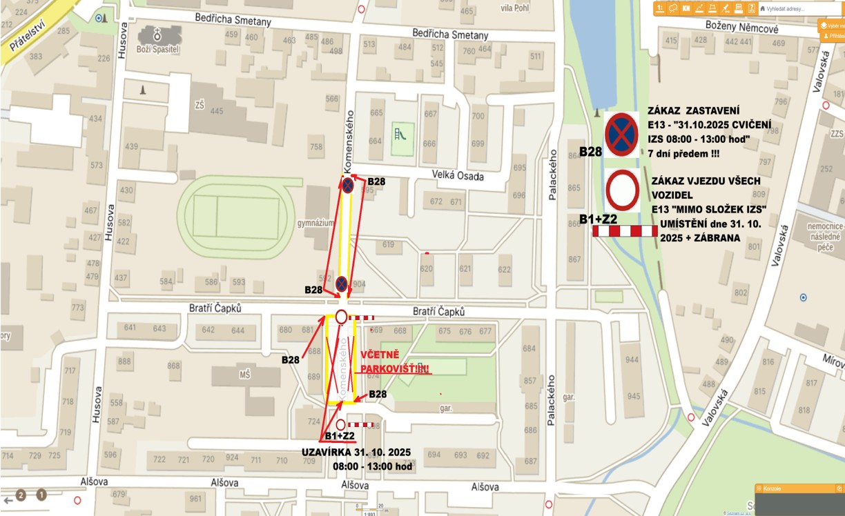 🔴 Z důvodu plánovaného cvičení bude dne 31. října 2025 od 8:00 hodin Komenského ulice u Gymnázia uzavřena pro dopravu. V další části Komenského ulice dojde k dopravnímu omezení (zákaz zastavení).