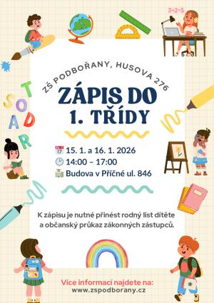 Ve dnech 15.01.2026 a 16.01.2026 od 14:00 do 17:00 proběhnou v Budově v Příčné ul. 846 zápisy do 1. třídy ZŠ Podbořany, Husova 276